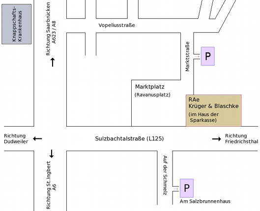 Die Kanzlei hat ihren Sitz zentral im Sulzbachtal (Sulzbach, SB-Dudweiler, Friedrichsthal, Quierschied) unweit der Kreisstädte St. Ingbert und Neunkirchen sowie der Landeshauptstadt Saarbrücken.